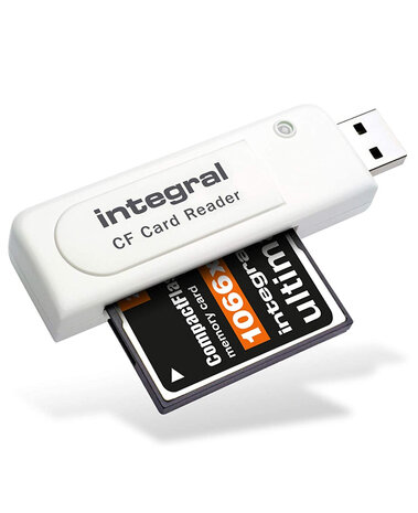 Deze Compact Flash geheugenkaartlezer van het merk Integral zet je foto's snel over op je computer. Alleen geschikt voor Compact Flash kaartjes.